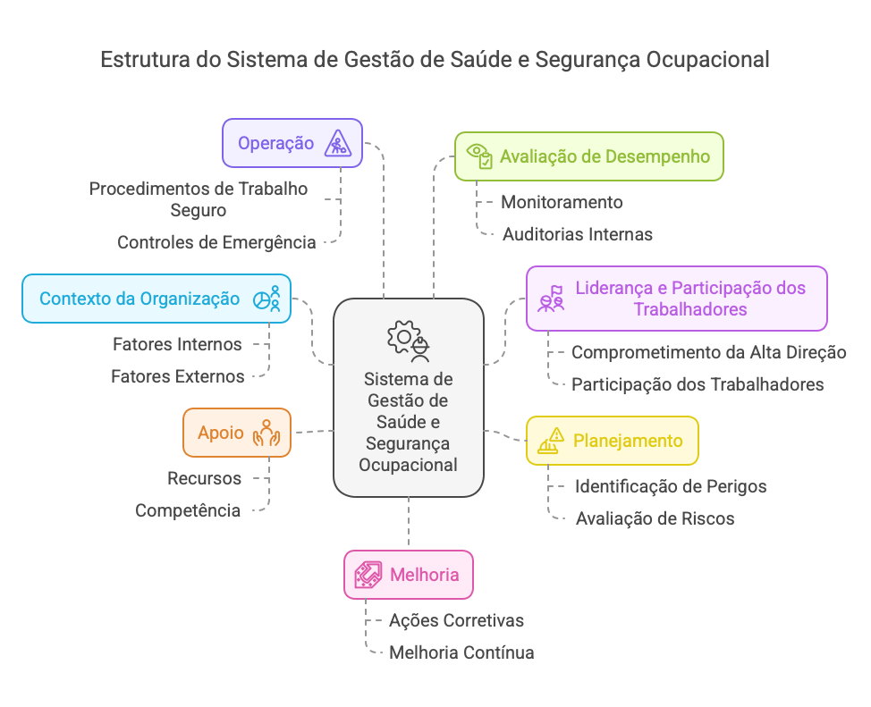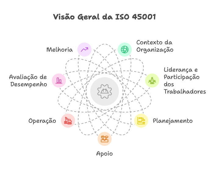 A ISO 45001 segue a chamada “High-Level Structure” (Estrutura de Alto Nível) adotada pela ISO para padronizar a forma como as normas de sistemas de gestão são organizadas. Essa estrutura facilita a integração com outras normas como a ISO 9001 (Qualidade) e a ISO 14001 (Meio Ambiente).