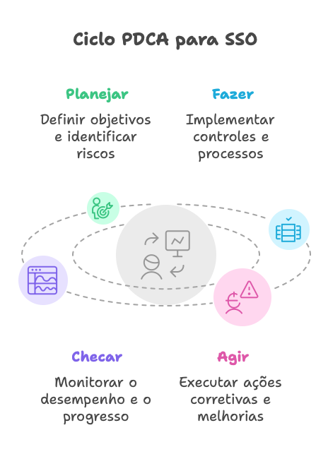A norma adota o Ciclo PDCA (Plan-Do-Check-Act) como base para a melhoria contínua e a abordagem de riscos (risk-based thinking) como forma de identificar, avaliar e tratar riscos e oportunidades de SSO. Isso significa: