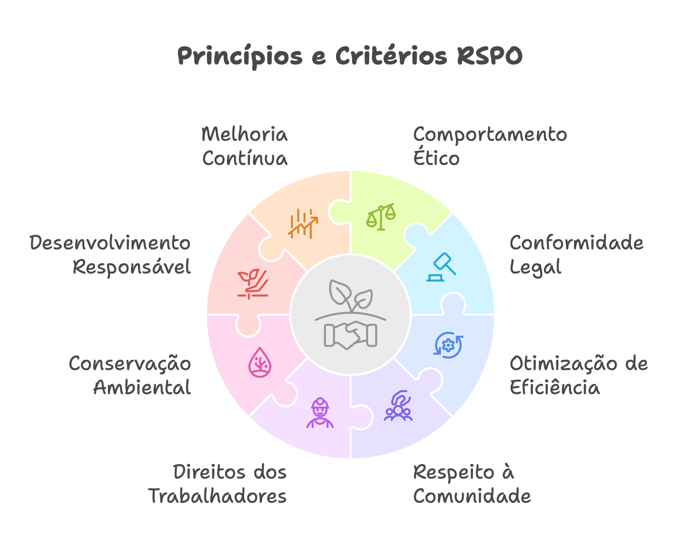 A RSPO define um conjunto de Princípios e Critérios (P&C) que devem ser atendidos para que uma organização se torne certificada. A versão mais recente (atualizada em 2018 e aplicada com ajustes em anos subsequentes) foca em oito princípios principais: