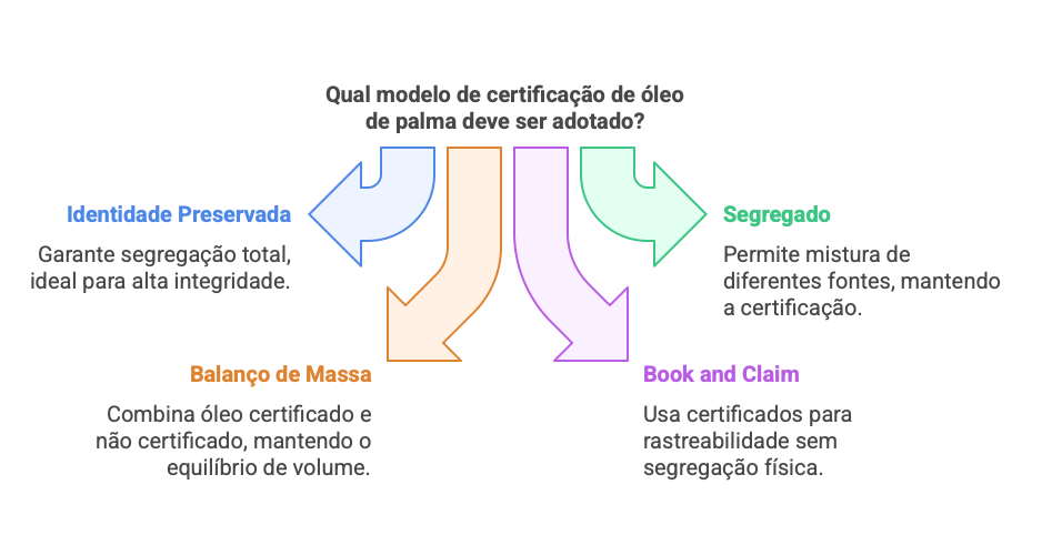 A RSPO adota diferentes modelos de certificação, que variam de acordo com a rastreabilidade e a separação do óleo de palma sustentável: